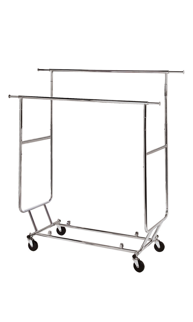 The double rail folding rolling rack offers all the amenities of our salesman folding rack but twice the hangrail capability. This rack offers the perfect solution to effectively display your merchandise. A rack with an attractive chrome finish lends itself to a variety of uses inside your store. This rack easily collapses down to an amazing 4” and can be stored easily in a vehicle, closet or under the bed.